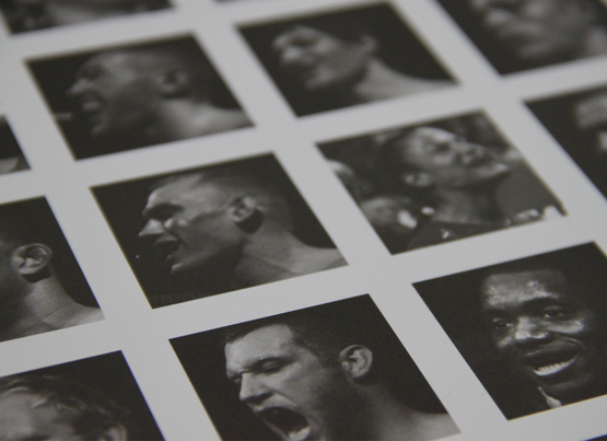 Portraits of mixed martial artists showing a state official their mouth piece before a fight.
